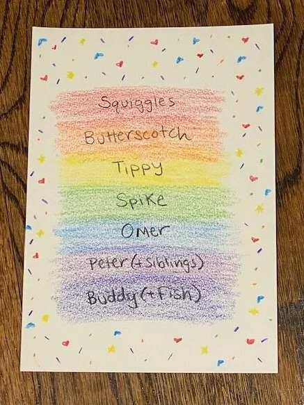 With her guidance, I took out my colored pencils and wrote each animal’s name on a piece of paper, then I decorated it with rainbow designs.